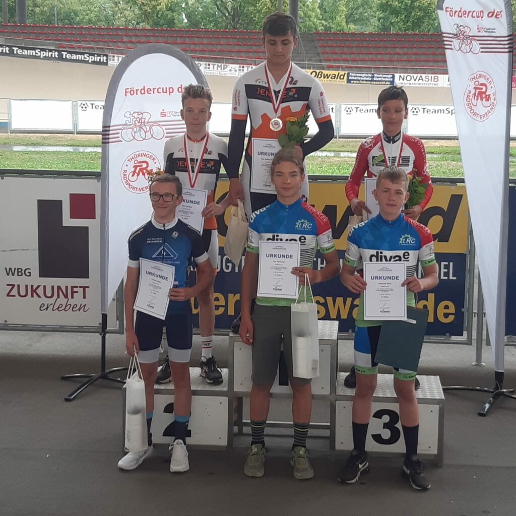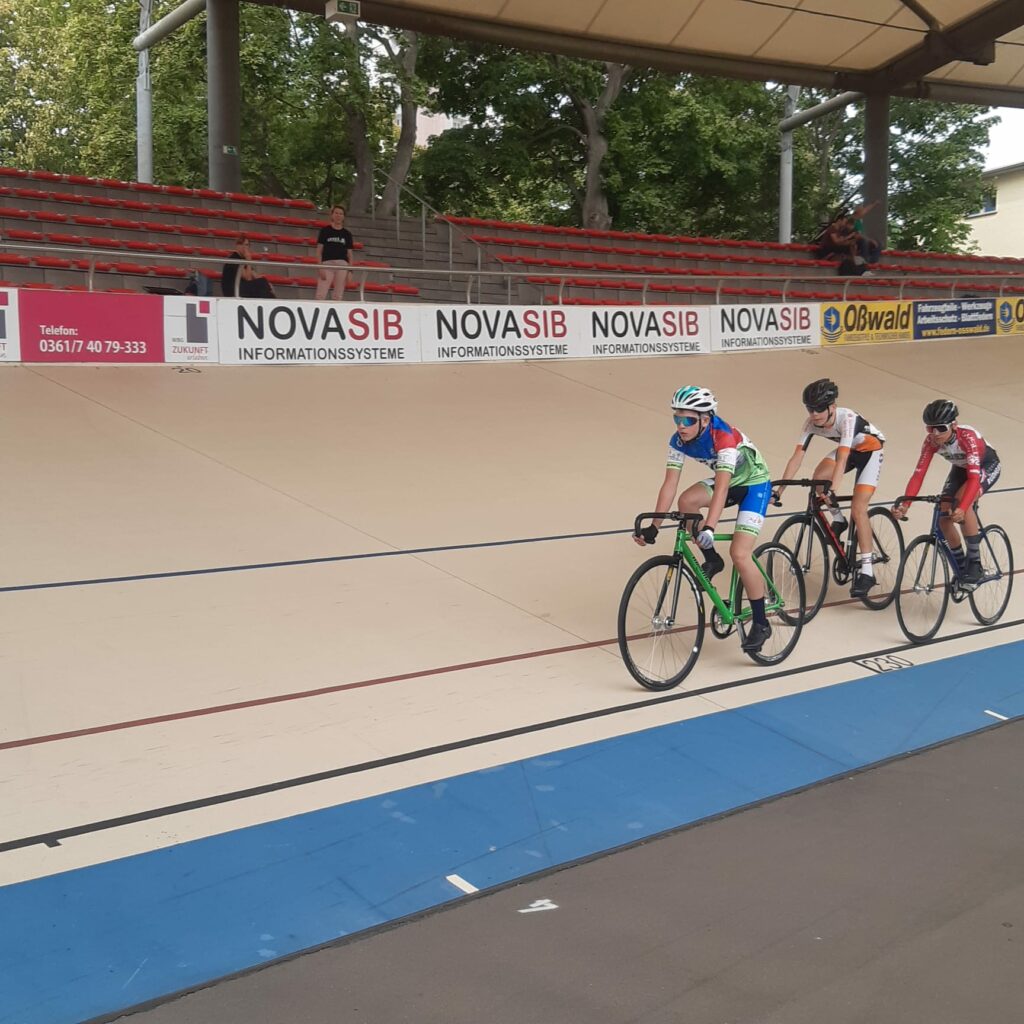 Am 20.08.22 fand in Erfurt auf der Bahn die LV-Meisterschaft Kurzzeit für die U13-U15 m/w statt. Für den 1. Radclub Jena starten die beiden U15-Jungs Valentin Koch und Jan Hammerl. Der Sprintwettkampf wurden im vereinfachten Poolsprintmodus ausgetragen, wobei die Qualifikation über 125 m mit stehendem Start und über 100 m mit fliegendem Start erfolgte. Mit einem 9. (125 m) und einem tollen 2. Platz (100 m in 6,54 s) in der Quali konnte Jan sich auf den 5. Platz in den Sprints behaupten. Valentin belegte am Ende den 6. Rang nachdem er in den Qualifikationsläufen den 4. (125 m) und den 5. Platz (100 m) einfahren konnte.
