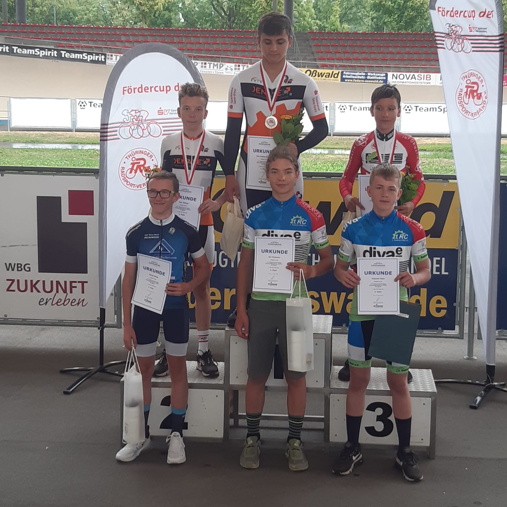 Am 20.08.22 fand in Erfurt auf der Bahn die LV-Meisterschaft Kurzzeit für die U13-U15 m/w statt. Für den 1. Radclub Jena starten die beiden U15-Jungs Valentin Koch und Jan Hammerl. Der Sprintwettkampf wurden im vereinfachten Poolsprintmodus ausgetragen, wobei die Qualifikation über 125 m mit stehendem Start und über 100 m mit fliegendem Start erfolgte. Mit einem 9. (125 m) und einem tollen 2. Platz (100 m in 6,54 s) in der Quali konnte Jan sich auf den 5. Platz in den Sprints behaupten. Valentin belegte am Ende den 6. Rang nachdem er in den Qualifikationsläufen den 4. (125 m) und den 5. Platz (100 m) einfahren konnte.