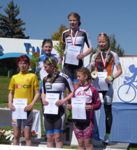Die Mädchen der U13 mussten den ganzen Hügel durch Witterda hochstrampeln. Miriam Zeise machte auf der Steigung von Anfang an Druck und hielt auf diese Weise einige der sprintstarken Konkurrentinnen auf Distanz. Sie ließ sich auch auf der rasanten Abfahrt und im Flachstück nicht abschütteln und kam in einer Dreiergruppe auf die Zielgerade, wo sie lediglich die neue Landesmeisterin Lara-Sophie Jäger ziehen lassen musste. Glückwunsch zur Silbermedaille! Auch Tanja Spath kam gut den Berg hinauf, verlor dann aber den Kontakt zur Spritengruppe. Im finalen Sprint der Verfolger sicherte sie sich überlegen den 7. Platz. Anika Pesel und Jennifer Seewald vom jüngeren Jahrgang kämpften sich wacker über den selektiven Kurs und belegten die Plätze 16 und 19.