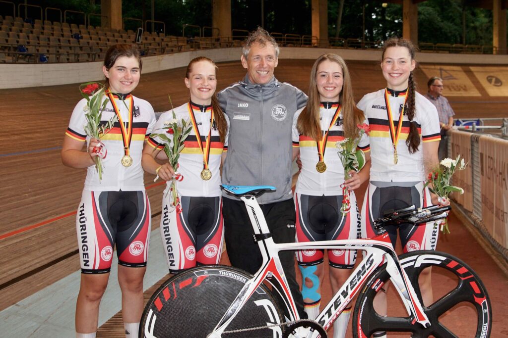 Wir sind überglücklich, dass unsere Athletin Miriam Zeise bei der Deutschen Meisterschaft Bahn U15-U19 in Köln zusammen mit Ihren Team-Gefährtinnen Franzi Arendt (RSC Turbine Erfurt e.V.), Tasia Ballhaus (SV Sömmerda e.V.) und Lara Röhricht (SSV Gera 1990 e.V.) den 1. Platz in der U19 Mannschaftsverfolgung erkämpft hat. Mit ca. 1 Sekunde Vorsprung fuhren sie in die Meistertrikots. Herzlichen Glückwunsch zu dieser hervorragende Leistung!