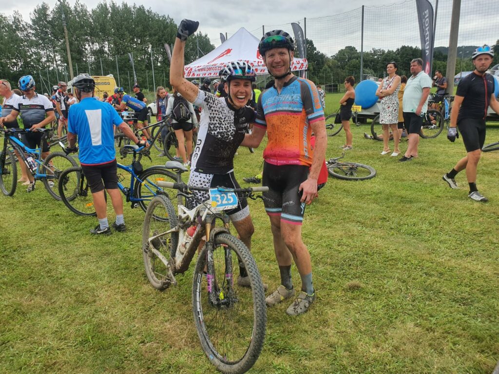 Das Rennen in Klatovy gehört mit zu unseren Lieblingsrennen. Typische tschechische wilde Wiesen, Waldwege und Trials mit einigen (tiefen) Flussdurchfahrten, fiesen Anstiegen und tollen Ausblicken über dem Böhmerwald (wenn man denn Zeit hat, mal rechts und links zu schauen). Das Rennen gehört zur MarathonMan Europe Serie, die wir dieses Jahr eigentlich zum größten Teil bestreiten wollten. Da dieses Jahr dann aber doch vieles anders läuft als geplant, sind wir froh, dass die Veranstalter in Klatovy trotzdem die Krönung des Král Šumavy (also dem König des Böhmerwalds) vornahmen. Um diese Titel zu bekommen, sollte man die Langstrecke (105 km und 3200 hm) gewinnen. Wir reisten schon Freitag an, um vor Ort die Vorbelastung zu fahren und einen ersten Eindruck der Strecke(ngegebenheiten) zu erlangen. Samstagfrüh um 7:30 Uhr war dann unser Start. Wir beide platzierten uns von Anfang an jeweils gut im Feld und fuhren dann weiter unser eigenes Tempo. Nach dem Start habe ich auch lange keine Frau gesehen, erst ab Kilometer 33 fuhr von hinten eine auf. Ich ließ sie ersteinmal fahren, denn das Rennen und die Berge waren noch lang. Ein paar Minuten später hatte ich sie schon wieder eingesammelt. Micha erreichte nach 5:35 Stunden als 14. gesamt und 7. in seiner Altersklasse das Ziel, ich nach 6:06 Stunden als 1. Frau gesamt (gut eine Minute vor der Zweiplatzierten). Im Nachmittag wurde ich somit zur Königin des Böhmerwaldes gekrönt.