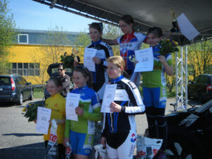 Hesse die Farben des 1. Radclub Jena. Am Start gab es einen kleinen Unfall durch einen Dominoeffekt, in den etwa ein Viertel des Feldes involviert war. Lorenz kam davon und war an 3. Position, als das Feld für einen Neustart abgefangen wurde. Nach dem Neustart kämpfte er im Rennen über 6 Runden ausgezeichnet, verlor jedoch zur Hälfte der Distanz den Kontakt zur Spitze. Am Ende stand er mit Platz 13 in der Ergebnisliste. Die „Ausländer“ abgerechnet hätte eine Top-10-Platzierung ergeben. Im Anschluss sprinteten die Mädchen der U13 im Kriterium über 9 Runden um Punkte. Unsere beiden Leistungsträgerinnen Tanja Spath und Miriam Zeise waren dabei immer in der Führungsgruppe vertreten. Zur Hälfte des Rennens verabschiedeten sich jedoch zwei Solistinnen an der Spitze und machten die Topplatzierungen unter sich aus. Dahinter kamen unsere Mädels zu wichtigen Punkten. Am Ende belegte Miriam den 3. Platz und Tanja wurde 5. Anschließend wurden ihre Mannschaftskameraden bei den Jungen gefordert. Im Feld von ca. 60 Sportlern zeigte vor allem Alfred Hesse über 12 Runden sein gutes Trainingsniveau. Doch von Anfang an: Nach dem Start bildete sich eine ca. 35 Mann starke Spitzengruppe und dahinter versuchten nochmals 10 Sportler die Lücke zur Spitzengruppe zu schließen. In der Spitze fuhren anfangs Alfred und Felix Wagner sowie in der Verfolgung Kilian Hofmann. Felix war dabei taktisch sehr gut platziert und Alfred klemmte am Ende der Gruppe, die vom Anfang bis zum Ende mit hohem Tempo die einzelnen Runden abspulte. Felix musste diesem Tempo Tribut zollen und fiel in der 3 Runde aus der Gruppe heraus in die Gruppe von Kilian. Alfred strebte genau die Gegenrichtung an und kämpfte sich Runde um Runde weiter nach vorn. Am Ende standen die 3 Sportler mit den Platzierungen 9 für Alfred, 41 für Kilian und 43 für Felix auf dem Papier. Bleibt somit nur noch vom Rennen der U15 zu berichten. Durch eine Fehleinschätzung – die vorhergehenden Felder hatte man nach Cupstand aufgestellt – stand Tobias Wegbrod leider nur im hinteren Drittel an der Startlinie. Das Rennen begann sofort mit hohem Tempo und vielen Attacken, sodass es Tobias nicht möglich war, aus der sich sofort zu Anfang gebildeten zweiten Fahrergruppe zur ersten Gruppe aufzuschließen. Er versuchte, mit wenigen Mitstreitern die Lücke zur Spitze zu schließen, was aber aufgrund des angesprochenen hohen Tempos nicht gelang. Zwar kam man nochmals auf 50 m heran, aber die Entscheidung vorn war gefallen. Immerhin konnte er den Sprint in seiner Gruppe für sich entscheiden und belegte am Ende einen guten 17. Rang. Maximiliam Poelen kam in der U17 auf Rang 9 ins Ziel.